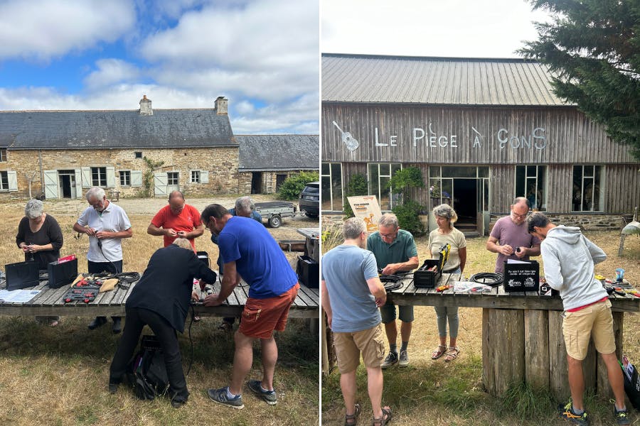 C’est parti pour l’atelier de câblage. Chacun·ne prend les éléments de son kit, s’installe dehors, sur les tables, pour commencer le montage. Nous leur avions au préalable fourni une liste d’outils indispensables : les présent·es sont arrivé·es bien équipé·es, une belle occasion de s’entraider.