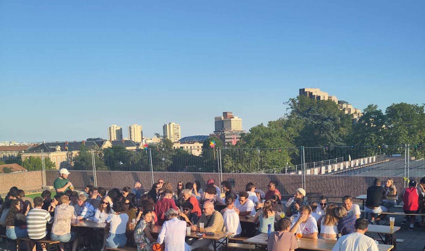 Du 12 juillet au 12 octobre, les équipes de la Halle Tropisme investissent le toit du Corum de Montpellier. L'héliport inutilisé au sommet du Palais des Congrès et rebaptisé Panorama, se transforme en rooftop festif avec des évènements culturels. La Halle Tropisme alimente en électricité d'Enercoop ses espaces rue Fontcouverte à Montpellier, on a voulu soutenir le projet.