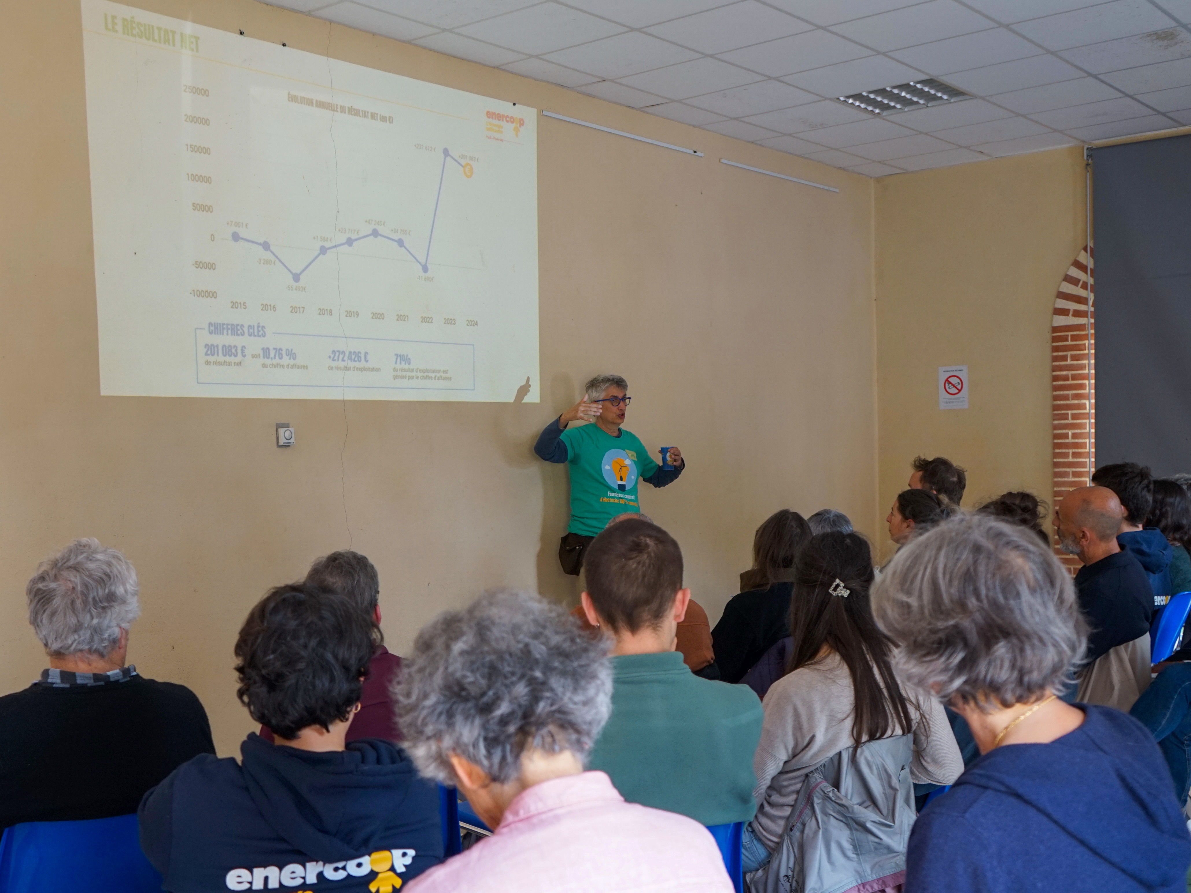 Après le jeu, place au sérieux… mais toujours dans la bonne humeur. François Richer, administrateur d’Enercoop Midi-Pyrénées, a présenté le rapport de gestion et les différentes résolutions qui seront soumises au vote lors de notre assemblée générale.