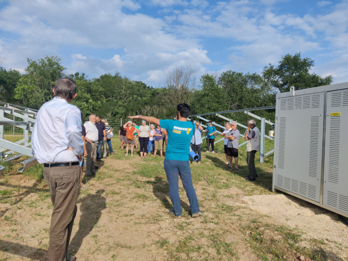 Le terrain du parc a été repéré par un sociétaire habitant du village. Il a aussi suivi les travaux et a pris la parole lors de la visite pour appuyer notre vision de la transition : " le renouvelable n'est intéressant que s'il y a une vraie politique de sobriété énergétique". La directrice générale de notre coopérative a aussi pris la parole pour insister sur le projet citoyen que nous représentons.