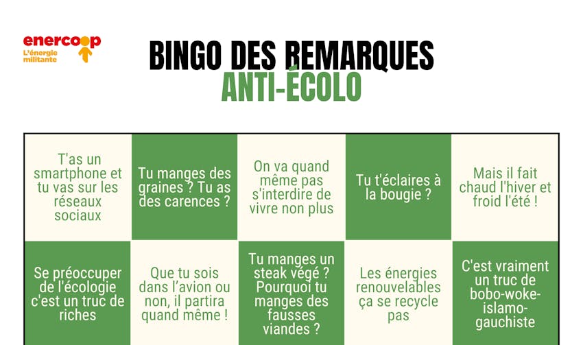 Si vous connaissez Enercoop, c'est que vous avez une certaine sensibilité pour les questions de transition écologique, de transition énergétique et plus largement pour les questions environnementales. Il serait peut-être même adéquat de vous qualifier "d'écolo". Et dans ce cas, vous avez sûrement déjà entendu l'un des arguments de ce bingo, qui dénigre les efforts de celles et ceux engagés pour l'environnement et sa préservation. La question est donc de savoir : les avez-vous déjà tous entendus ? Faites le point avec notre bingo des remarques anti-écolo.