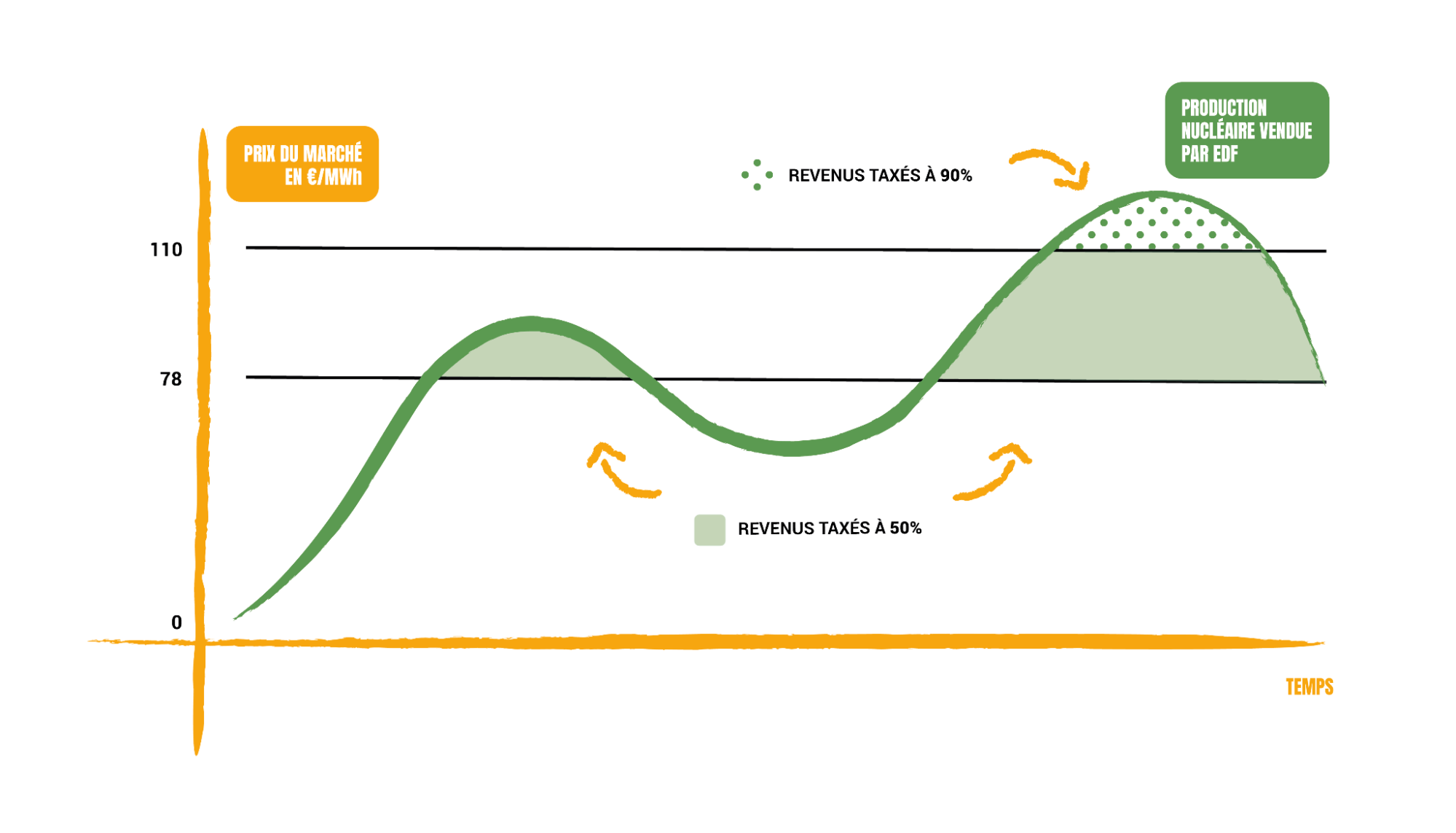 Le VNU prévoit une captation et une redistribution a posteriori, aux consommateurs et consommatrices, des revenus qu’EDF tire de la vente de sa production nucléaire. Le mécanisme prend la forme d’une taxe, à hauteur de 50 % des recettes du producteur excédant un premier seuil dit « de taxation », et 90 % des revenus excédant un second seuil dit « d’écrêtement ».