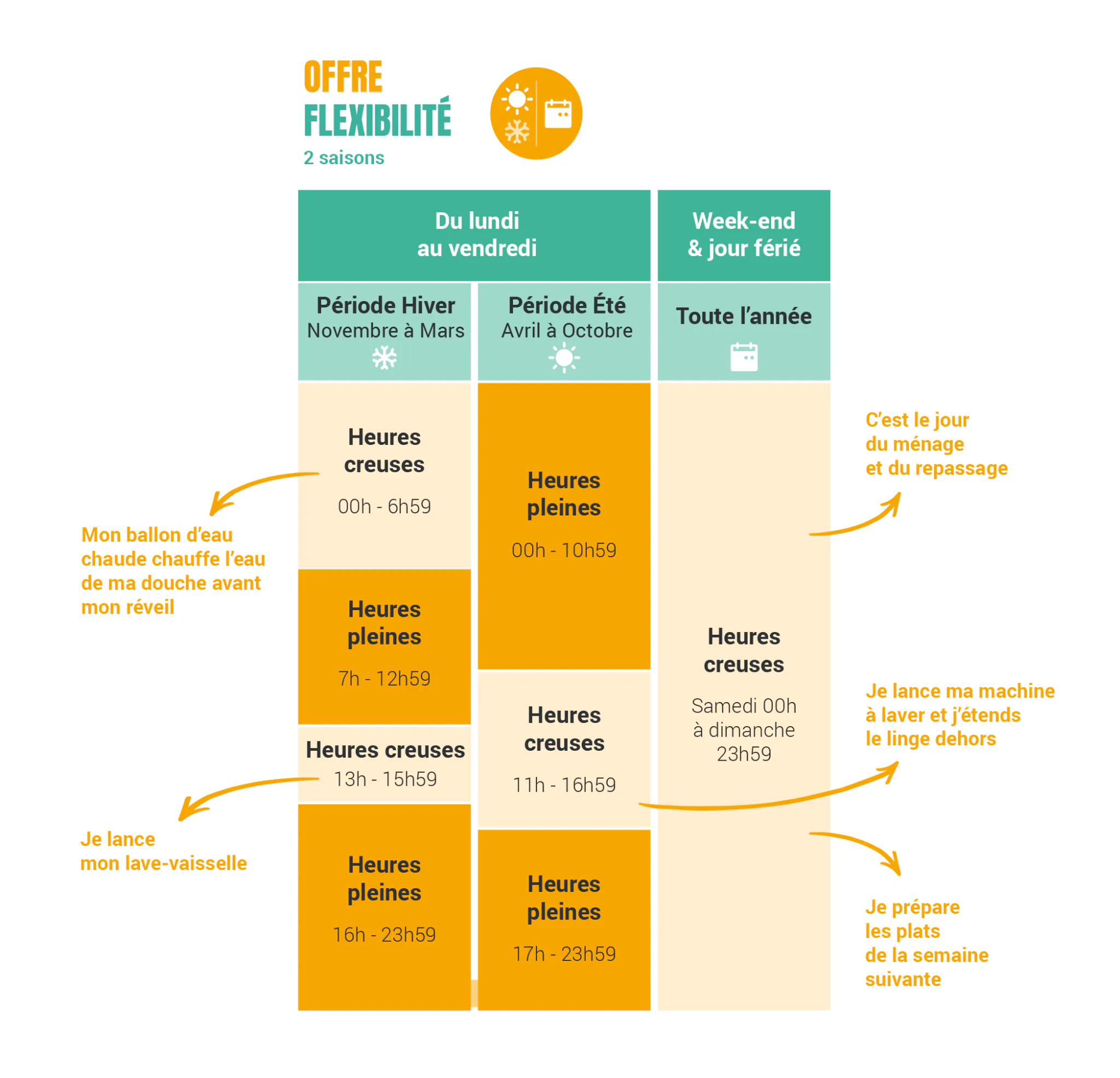 Des heures creuses dans la journée et la nuit en semaine selon la saison ("Hiver" : 0h-7h et 13h-16h / "Eté" 11h à 17h), tout le week-end et les jours fériés. Les horaires sont définis par Enercoop comme suit :