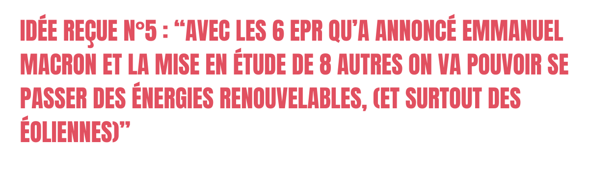 Ce genre de discours est dangereux et malheureusement trop répandu. Dangereux ? car, comme nous le verrons plus en détail dans un prochain article, pour garantir notre approvisionnement énergétique et atteindre nos objectifs climatiques, nous devons impérativement massifier le déploiement de toutes les énergies renouvelables, même si l’on construit 14 nouveaux réacteurs nucléaires. Répandre cette idée que les énergies renouvelables ne sont pas indispensables c’est faire de la désinformation et se mettre en travers de l’atteinte de la neutralité carbone.