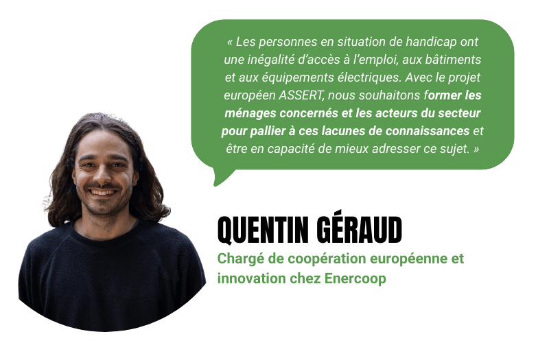 Enercoop se mobilise avec le projet ASSERT, soutenu par l'Union Européenne, pour fournir un accompagnement spécialisé, des formations et une expertise aux collectivités, aux organismes parapublics et semi-publics, ainsi qu'aux associations et ONG sur le terrain afin de réduire la vulnérabilité énergétique des personnes avec un handicap physique.