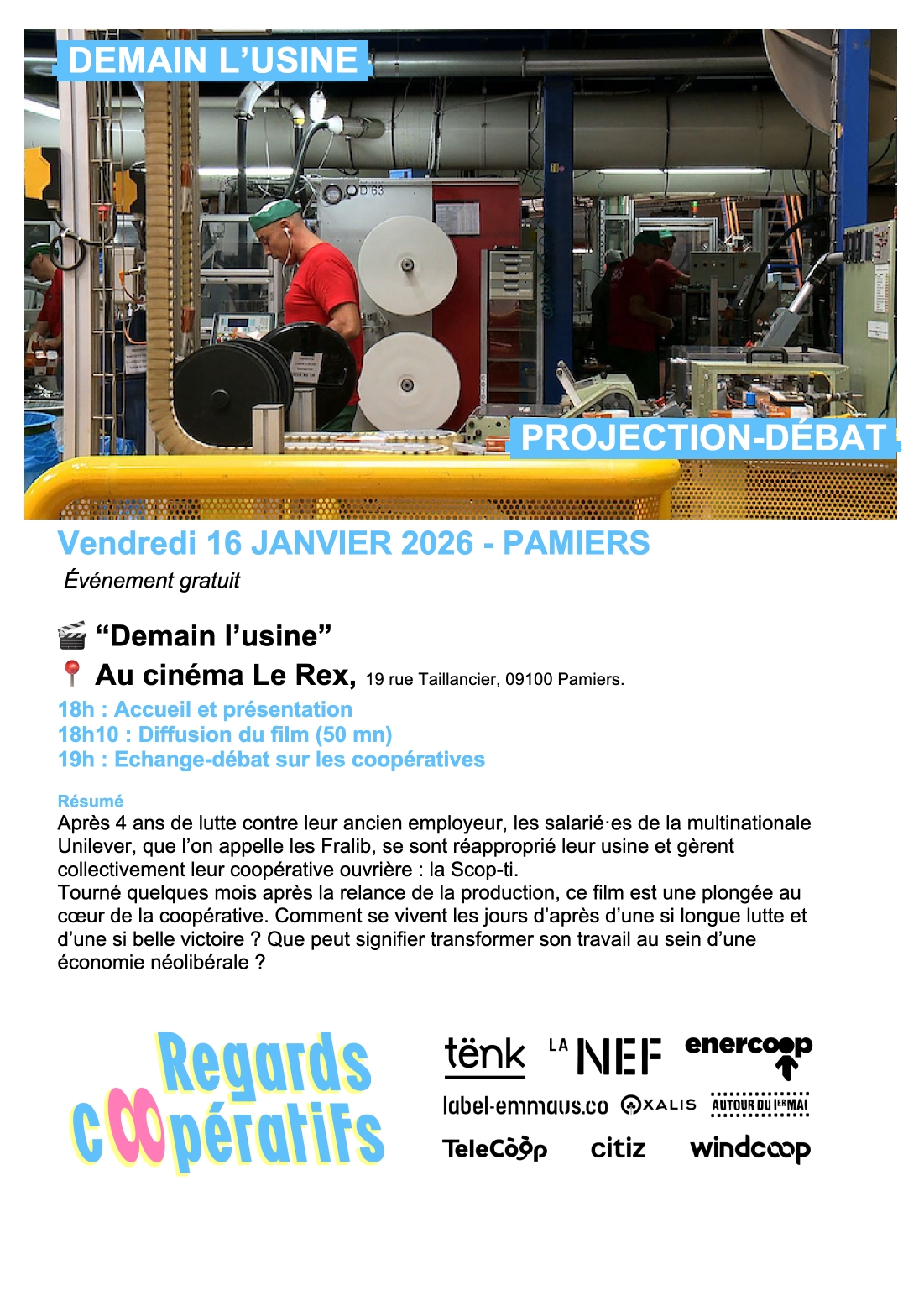Le vendredi 16 janvier, rendez-vous au REX de Pamiers (09), pour une soirée projection-débat organisée par notre sociétaire bénévole Bernard Brunet, dans le cadre du dispositif Regards Coopératifs dont Enercoop est partenaire. Une belle opportunité pour échanger sur nos pratiques, partager nos engagements et faire vivre ensemble les valeurs coopératives !