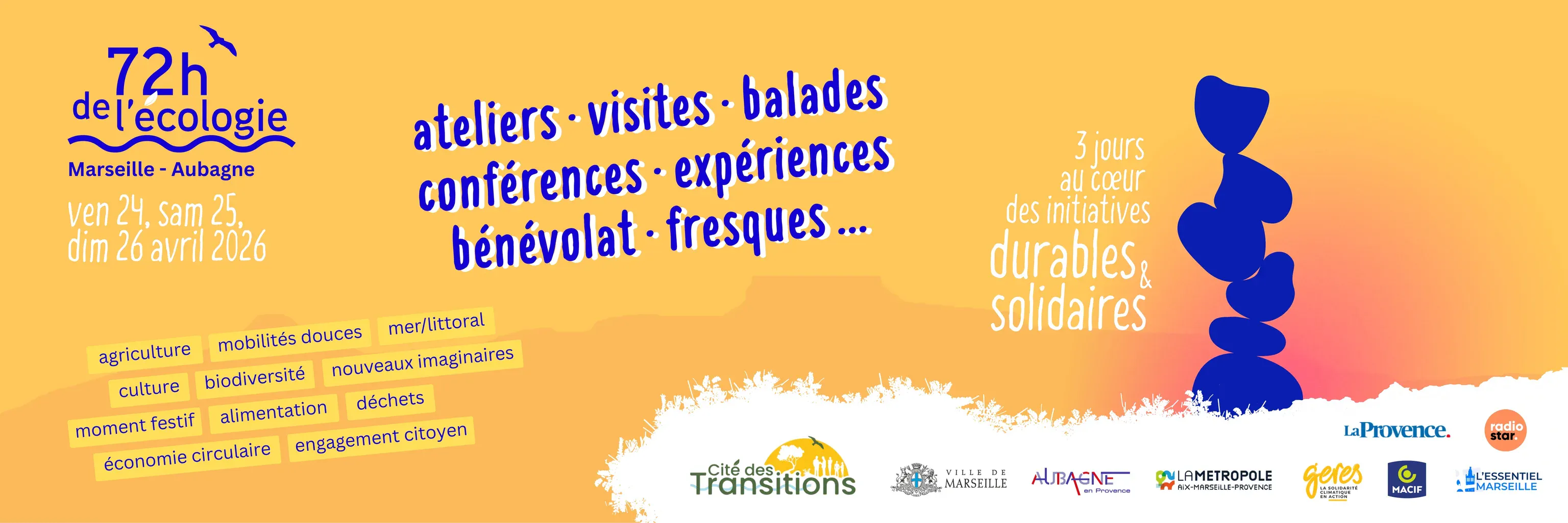 🗓️ RDV les vendredi 24, samedi 25 et dimanche 26 avril 2026 à Marseille et Aubagne pour les 72h de l'écologie organisées par la Cité des Transitions