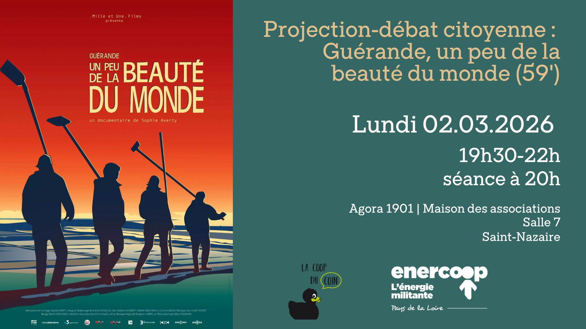 La Coop du Coin et Enercoop Pays de la Loire s'associent pour vous proposer une projection du documentaire "Guérande, un peu de la beauté du monde". L'occasion d'échanger sur nos pratiques et sur les forces et valeurs du modèle coopératif.