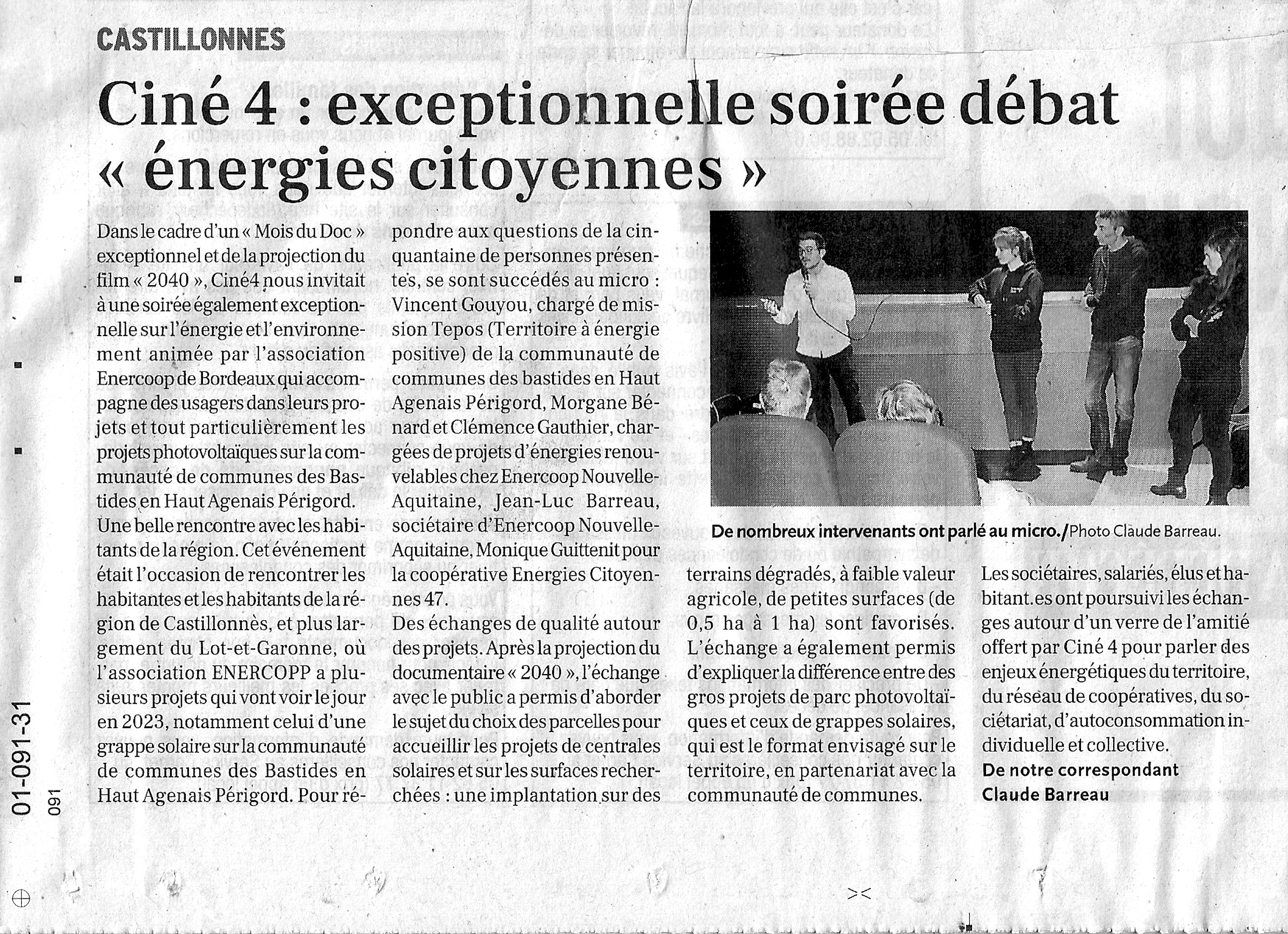 La commune de Castillonnès et la communauté de communes des Bastides en Haut Agenais Périgord, labellisée territoire TEPOS (Territoire à Energie Positive), sont impliquées et mobilisées en faveur du projet depuis son début. Plusieurs rencontres ont déjà eu lieu avec des élu.e.s de la commune, et notamment un ciné-débat le 18 novembre 2022 au Ciné 4 de Castillonnès.