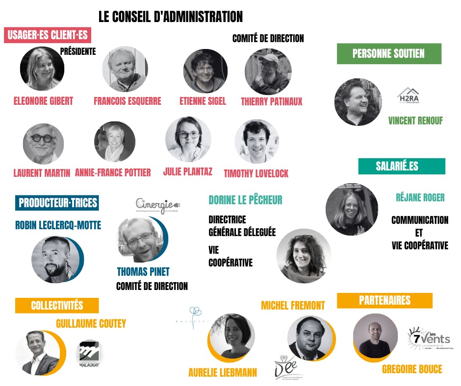 Le Conseil d'administration de la coopérative compte 18 sièges (15 sont occupés) et représente les 6 catégories de sociétaires. Un mandat dure 4 ans, les réunions du Conseil sont ouvertes aux sociétaires non élus. La présidente Eléonore GIBERT siège depuis le 28 juin 2021. Nous pratiquons des méthodes de gouvernance partagée, comme par exemple la Gestion Par Consentement (GPC) et l’Élection Sans Candidat (ESC).