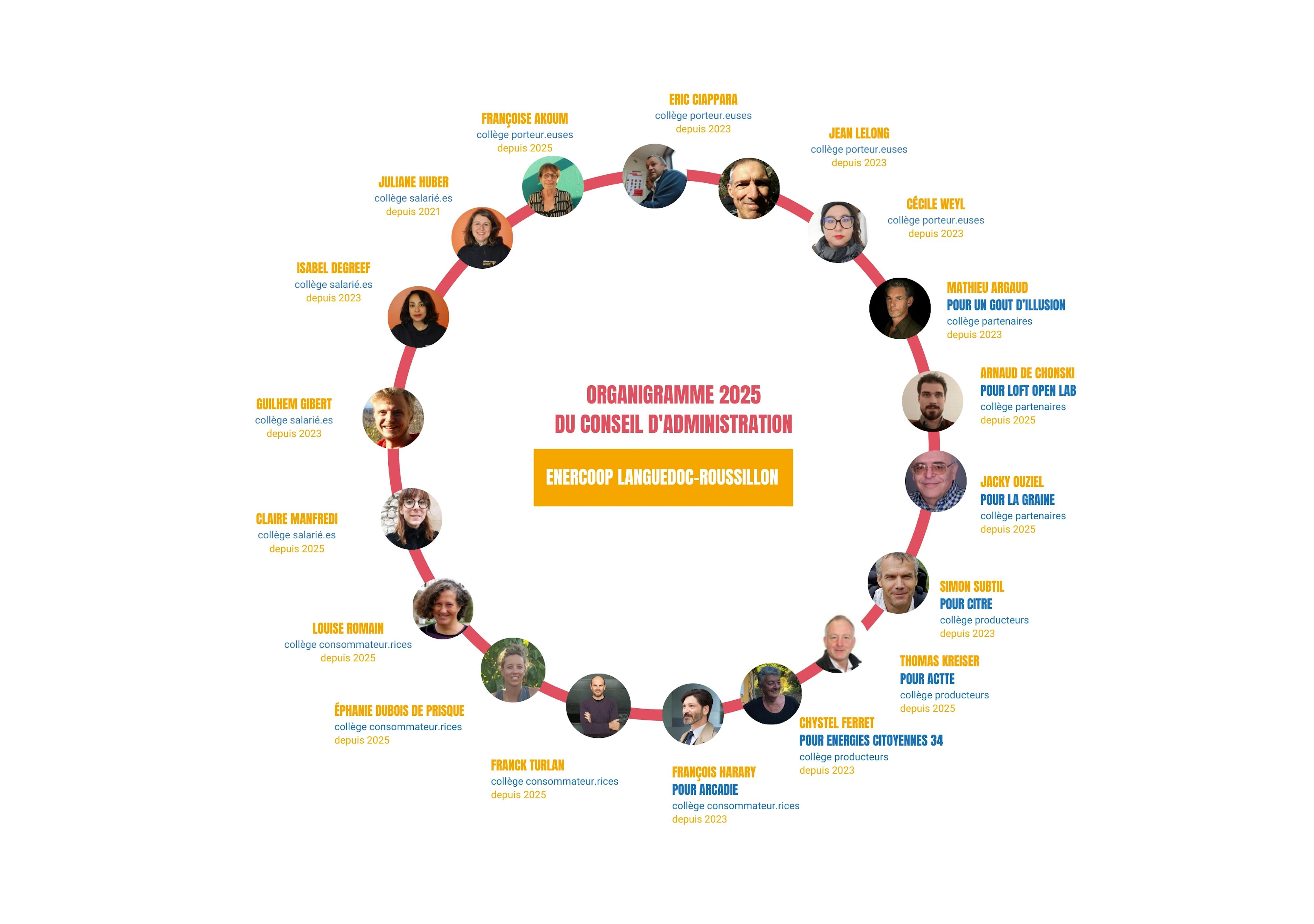 Pour la coopérative Enercoop Languedoc-Roussillon, le Conseil d’Administration (CA) a pour rôle d’orienter la stratégie, puis d’en suivre et d’en contrôler la mise en place opérationnelle. Dans les statuts de notre coopérative, c’est l’Article 26 qui explicite les pouvoirs du CA.
